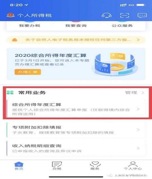 第一步:打开“个人所得税”APP,点击个人中心并登陆,点击“综合所得年度汇算”或“2020综合所得年度汇算”。