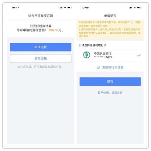 第六步:完成税款计算后,可查看退税金额,点击“申请退税”,并选择退税银行。