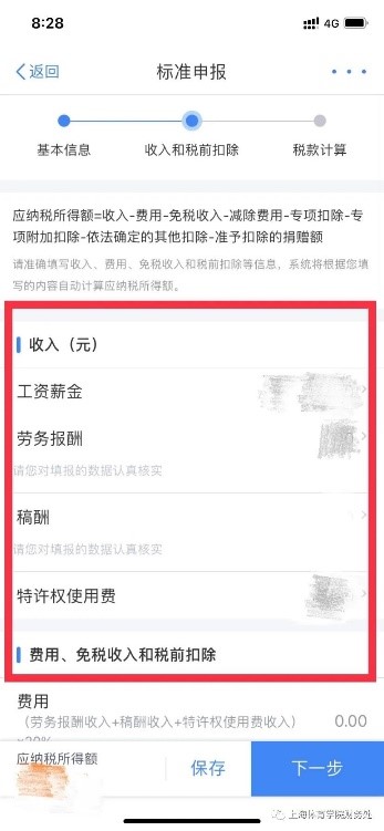 第五步:查看“收入和税前扣除”信息,确认无误后点击“下一步”