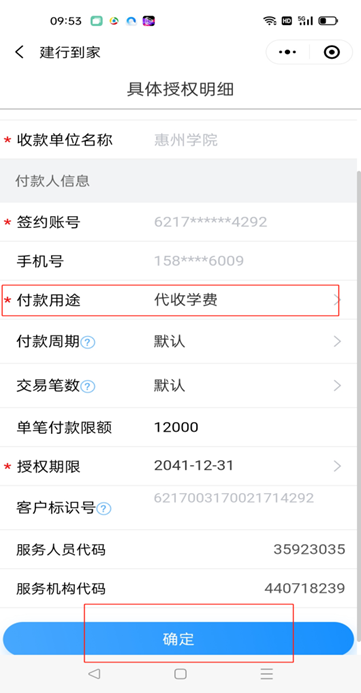 第二步:核对代扣信息,付款用途选择“代收学费”。
