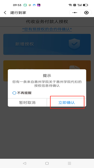 为进一步做好新生缴费工作,保证学校教育收费及时收缴,财务处将于9月28日进行2021级新生授权代扣学费签约业务工作。请各二级学院务必高度重视,及时通知学生:在收到银行授权扣款短信通知时,需在9月30号前用微信扫码登录“建行到家”小程序办理授权扣款签约确认。另因银行系统升级,请勿回复短信内容,直接扫码操作即可,否则会造成代扣学费签约失败。具体操作流程如下: